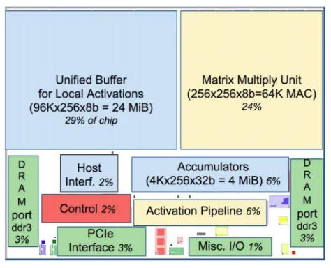 Below you'll find a system diagram and a layout mockup for the older TPUv1. These won't necessarily apply to the newer TPUv2 and TPUv3 — Google has made some architectural changes since this documentation came out. However, I'm not aware of newer reference material or documentation for the newer chips, so we'll stick with the TPUv1. I'll go over the most visible differences between versions later.