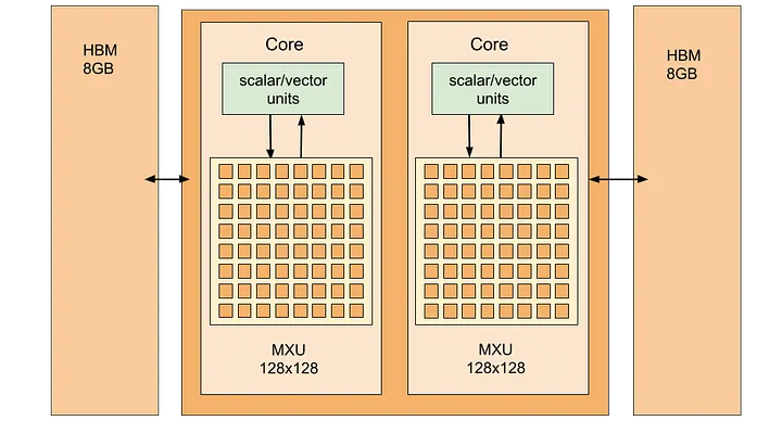 - The MXU in the TPUv1 was an 8-bit integer 256x256 array, larger and less precise than the 16-bit bfloat16 128x128 MXU in the TPUv2.